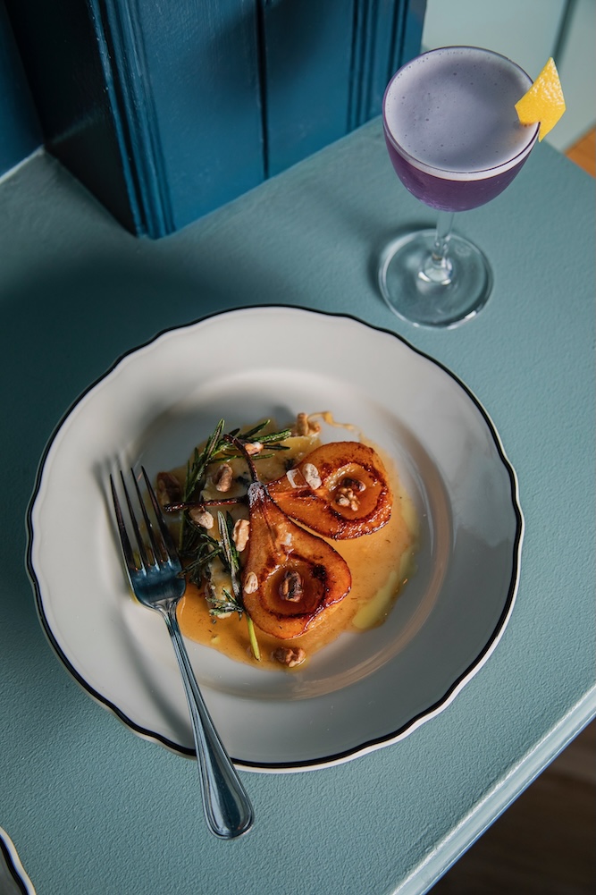 The decor is elegant, with dark colors, warm woods, large ornamental windows and moody lighting that gives the room a romantic glow. Cain served as executive director of big Burrito Restaurant Group’s catering division and executive chef at both Kaya and Soba, while Hirst has spent two decades designing bar programs for hotspots such as Soba, Sienna Mercato, Kingfly Spirits and Eleven Contemporary Kitchen.