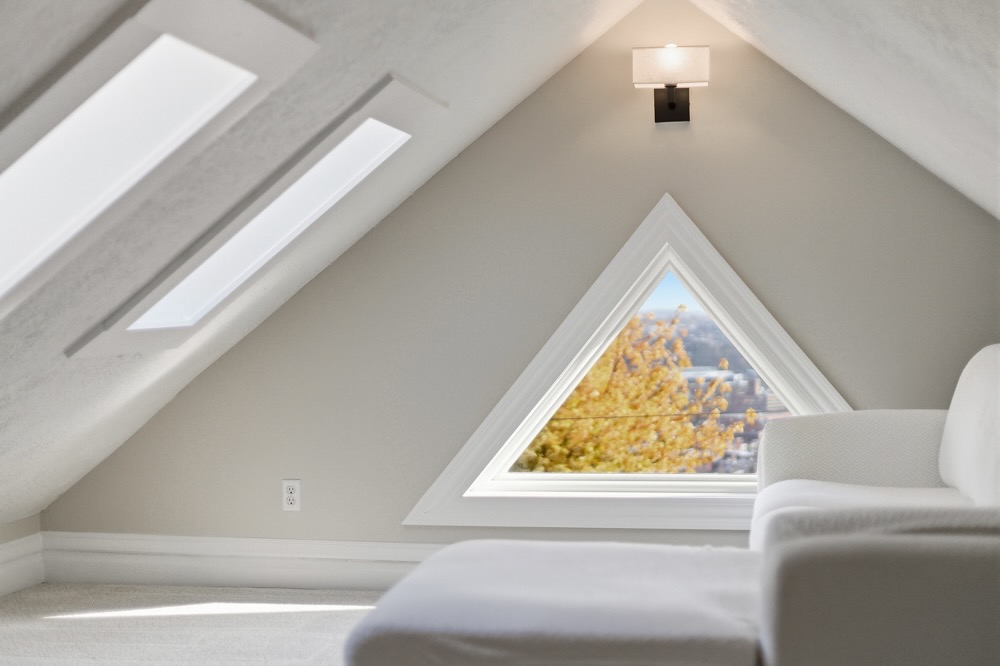 The third floor contains the second primary suite, which spans the entire footprint of the home and has a private balcony overlooking the city. The sharp angles and custom window layout of the third floor create a funky, flexible space that could just as easily be a family room or studio — there’s almost a treehouse vibe.